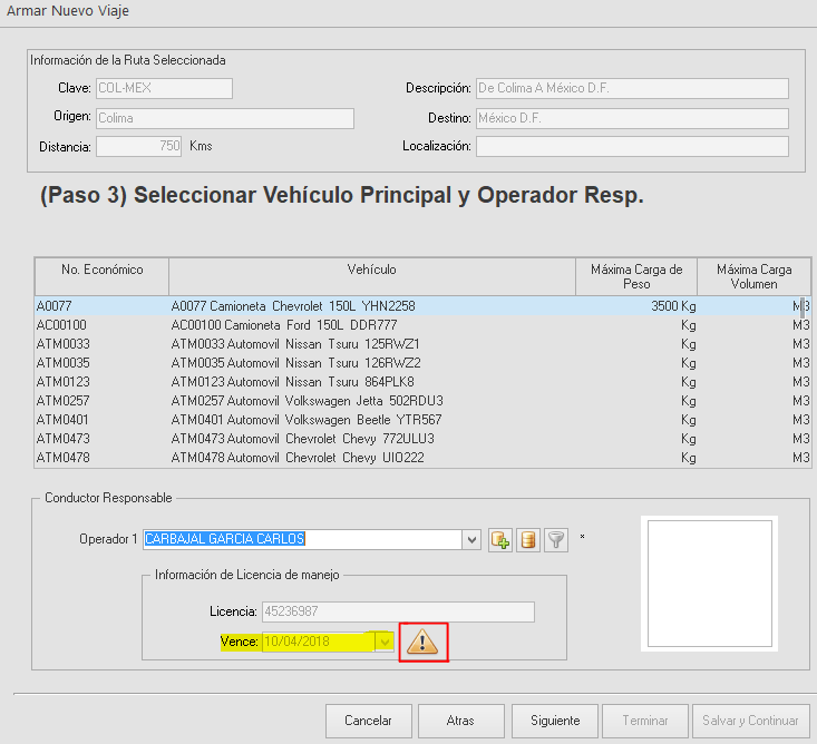 En el asistente para crear viajes dentro del grupo Logística se agrego una imagen de precaución cuando se asigna un conductor que tiene la licencia vencida.